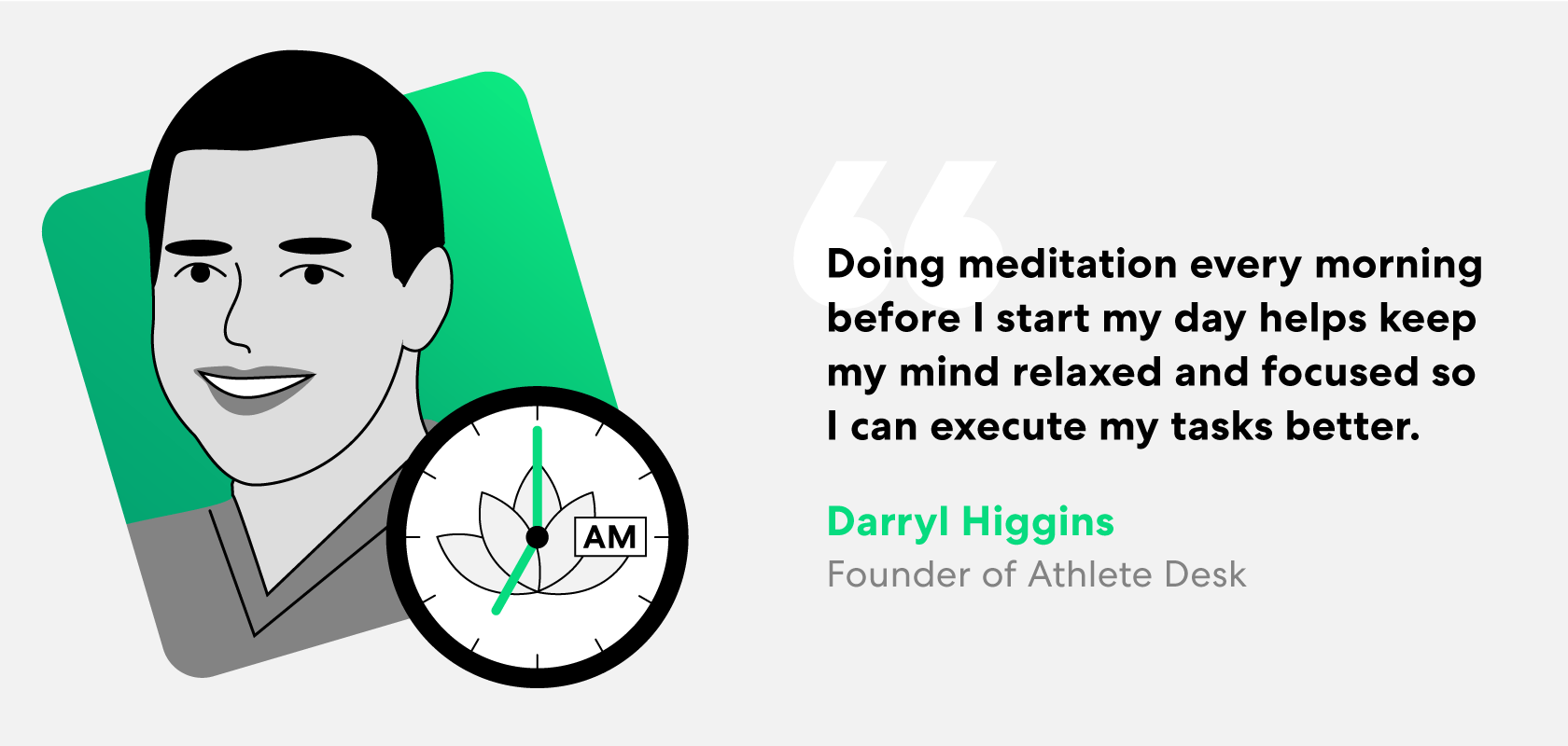 Meditation is a common practice among successful entrepreneurs — including Darryl Higgins, who is the founder of Athlete Desk. He recommends mediation as a way to not only relax you but keep you focused on the task at hand.