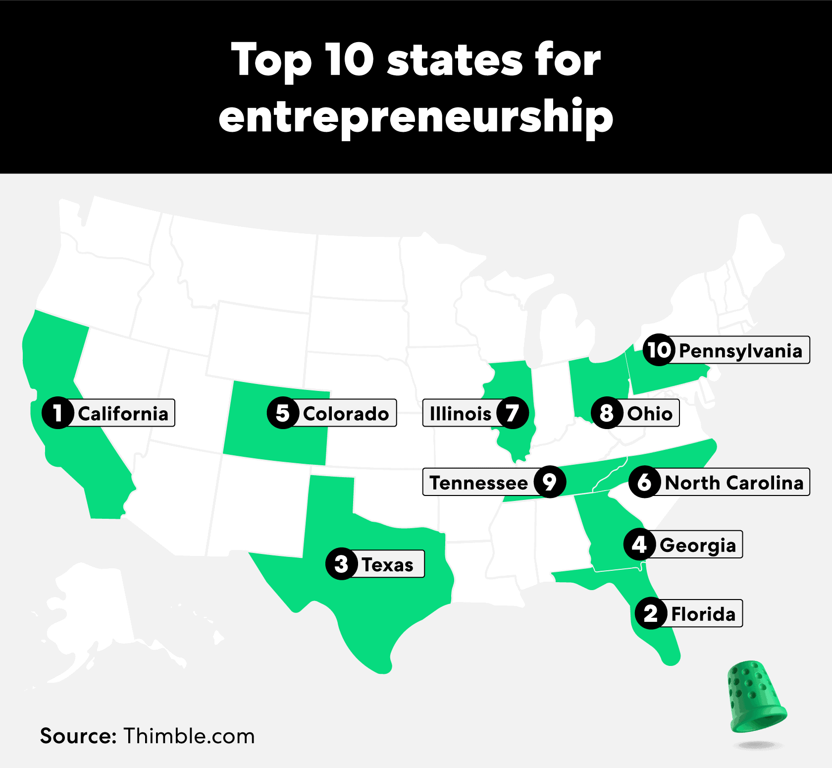 19. In 2020, the top five states for entrepreneurship were: California, Florida, Texas, Georgia, and Colorado.7
